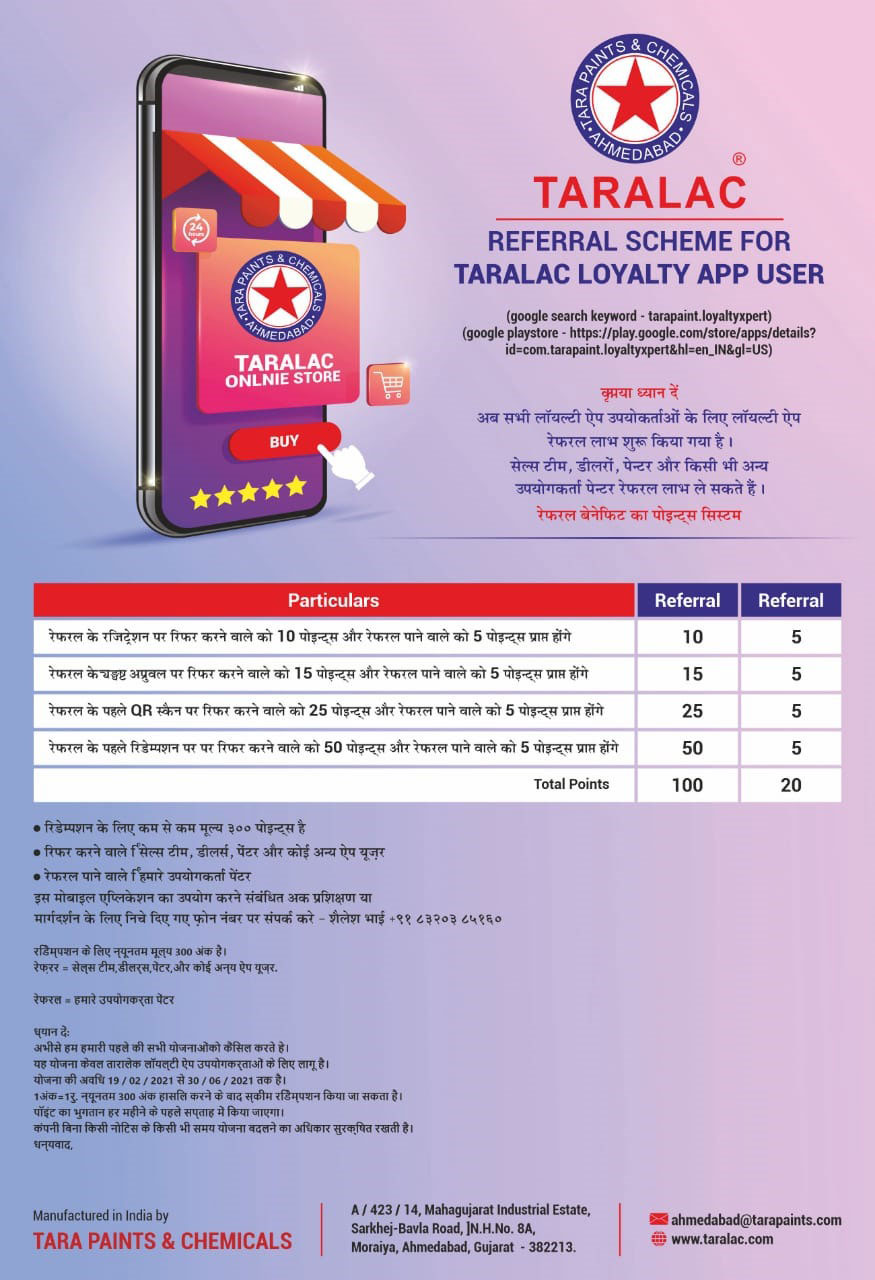 1) Taralac Loyalty Program is launched for exclusive use for Painters who are using Taralac brand